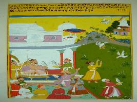 | Description / विवरण | Miniature painting based on Kalila Damana depicting is seated in his court. A royal man with a kite on his hand and king too have a kite on his hand. Saying in the world some are rich, some are poor, some strong and some weak. Painting having Mughal influence. |