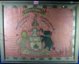 | Description / विवरण | Royal insignia of Bharatpur State made during the first world war. On top Bharatpur is written in English and The great war 1914-18, East Africa in Hindi and English. A Shiva temple, a tiger right side and an elephant left side also appear. |