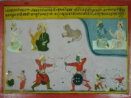 | Description / विवरण | Miniature painting based on Mahabharat depicting Bhishma telling to Duryodhana, Anshal and Brishak two brothers are good fighters bring them to fight for you. Karan has got curse of Parashuram, so he will get defeated by Arjun. |