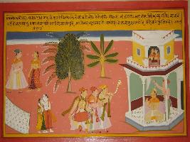 | Description / विवरण | Miniature painting based on Sanskrit drama - Prabodh Chandrodaya depicting two couples in the right side. Three people are playing musical instruments before a king sitting on palatial balcony. The painting says that in the fight of Vivek mind and kama desire if mind becomes victorious, then the life would be as bright as a king enjoying his life. |