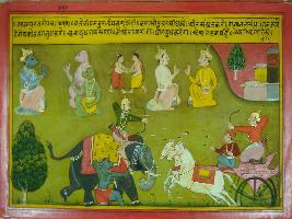 | Description / विवरण | Miniature painting based on Mahabharat depicting Bhishma telling to Duryodhana, Karan s son and king Jalasangha is fighting. Jalasangha is on the elephant back and fighting. It also depicts Karan s son is more powerful. |