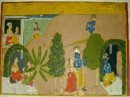 | Description / विवरण | Miniature painting based on Rasikpriya depicting Krishna waiting for Radha in garden and Radha talking to a friend in another bower. In the centre Krishna and Radha are shown walking together. |