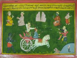 | Description / विवरण | Miniature painting based on Mahabharat depicting Bhishma telling to Duryodhana about the quality of Kauravas army as Shakuni, Ashwathama are equally powerful to Arjun. They cut the Sehnath parvat with their sword the arrows of Drona would kill lots of enemies at a time. |