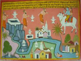| Description / विवरण | Miniature painting based on Eklinga Mahatmya depicting Rishi Gautam worshipping Linga and Shiv and Parvati appears before him. He asks for the producing of Ashram Linga on Brahmagiri mountain, Gautami Ganga asks him to give it the name of Ambikeshwar, Shiv bestows him with blessings. Then Shiv also produces Godavari river. The whole painting depicts the importance and blessings of Shiv. |