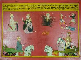 | Description / विवरण | Miniature painting based on Mahabharat depicting Bhishma telling to Duryodhana, Lakshmana will fight with Dusasana, Brihatbal and Sardoot will fight with arrows and will kill all the enemies. |