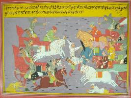| Description / विवरण | Miniature painting based on Mahabharat - Drona parva depicting fighting scene between Raja Mani Mon. Who was on side of Duryodhan and Somelutta. Who was on side of Pandavas Arrow s beeing shooted from both side. Somadutta cut his flag from rath, killed his chariuteer and later broke his chariuat. king thern sat on horse and carrying on fighting. |