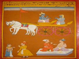 | Description / विवरण | Miniature painting based on Shri Bhagwat Gita. It depicts Krishna preaching Arjun that characters like pureness, truth, good behaviour, Parvati and Nibrati cannot be found in demons and evil persons. |