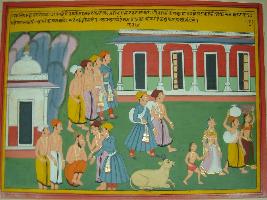 | Description / विवरण | Miniature painting based on Eklinga Mahatmya depicting Gautam rishi seated with folded knees and hand on his face, four people are standing around him. Some people are moving out of the village. |