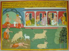 | Description / विवरण | Miniature painting based on Eklinga Mahatmya depicting a scene of house in the upper part and in the lower part, Gautam rishi is depicted feeding a cow but the cow runs away and the rishi fells on the ground. |