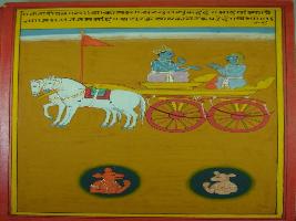 | Description / विवरण | Miniature painting based on Shri Bhagwat Gita. It depicts Krishna preaching Arjun that it is very difficult to find and attain him and it may takes many births. Krishna also says as the demons could not attain him they fall in hell. |