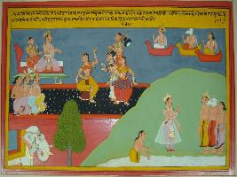 | Description / विवरण | Miniature painting based on Eklinga Mahatmya. Indra making three sinners to take holy dip in Ganga, freeing them of their sins and taking them to heaven in viman, Airavat Elephant is also depicted. |