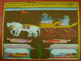 | Description / विवरण | Miniature painting based on Shri Bhagwat Gita. It depicts Krishna preaching Arjun that in the world who do adharma and who is cruel he will not swap off their tears. |