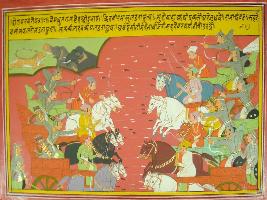 | Description / विवरण | Miniature painting based on Mahabharat - Drona parva depicting war scene between army of Pandavas and Kaurava. Madhutraja on side of Pandavas fight with kritvarma in a way a tiger fights with elephant. king Ambarast on side of Duryodhan fought with sendera and Sishu pal. Satya ki is shown fighting with jadava. |