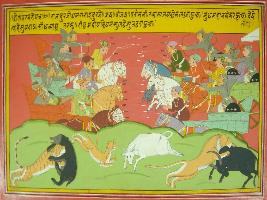 | Description / विवरण | Miniature painting based on Mahabharat - Drona parva depicting fighting scene between three brother s of Duryodhan Durje, jai and vijeay and daisen at upper upart of painting. jai sen is fighting as if,tiger is fighting with bear, leopold is fighting with coro and lion is fighting bull. |