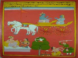 | Description / विवरण | Miniature painting based on Shri Bhagwat Gita. It depicts Krishna preaching Arjun that one who serve under Ahankar, Bal, Darap, Krodh would be jealous of those who are better than him. |