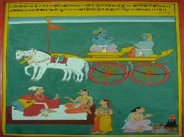 | Description / विवरण | Miniature painting based on Shri Bhagwat Gita. It depicts Krishna preaching Arjun about Karma, self esteem and Vidhi of Karma. |