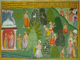| Description / विवरण | Miniature painting based on Eklinga Mahatmya. On the left side there is depiction of two Brahmans and their wives, in the middle part is some people collecting and plucking leaves, flowers etc. from trees, in the right side some people carrying sacks and a village. |
