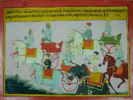 | Description / विवरण | Miniature painting based on Mahabharat depicting Sanjay telling king Dhritrashtra that after Ulluk s departure from their court, Kauravas prepared chaturangi sena for war, made Dhrityadhumna its commander and army is marching with spirit like ocean. |