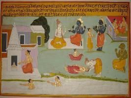| Description / विवरण | Miniature painting based on Kashi khand depicting Lord Vishnu telling Dhruv about Shiv mahima and advantages of worship and Kashi. Later he also explains him about Kashi and its importance over any ways of worship. |
