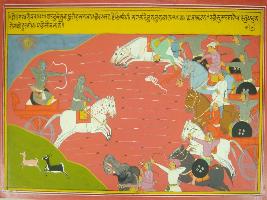 | Description / विवरण | Miniature painting based on Mahabharat - Drona parva depicting Arjun fighting with Sursarma and his brother and cut thier flags. Arjun cut the head of Sursarma s brother and throwing arrows like rain. |