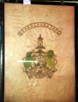 | Description / विवरण | Royal insignia of Bharatpur state embroidered on cotton cloth. An elephant and a lion is embroidered and Bharatpur in English written on top. |