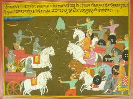 | Description / विवरण | Miniature painting based on Mahabharat - Drona parva depicting Arjun starts the war by blowing his conch. Then the Kauravas attacked him and throwing arrows on him in the way bees attacked and jumped over frowers and trees for honey. |
