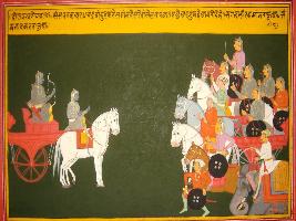 | Description / विवरण | Miniature painting based on Mahabharat - Drona parva depicting Arjun sitting on chariot which was beeing driven by Krishna looking and at chandra vhiu- a military tactics used by drona caharya. |