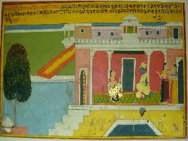 | Description / विवरण | Miniature painting based on Rasikpriya depicting Virah Rasa depicting Separation of Krishna and Radha and Krishna sitting in sad mood in his palace and female attendants around him. |