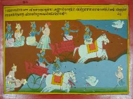 | Description / विवरण | Miniature painting based on Mahabharat depicting Krishna asking to Ulluk to inform Duryodhana that Dryudhana is like a bird whom Arjuna will defeat whether he will hide in Akash or patala and Bhima will take revenege of Draupadi. |