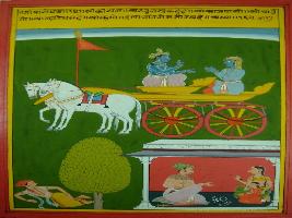 | Description / विवरण | Miniature painting based on Shri Bhagwat Gita. It depicts Krishna preaching Arjun that you will loss easily what he gain. This is his wealth and will spend easily. Just like this, is manorath. |
