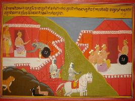 | Description / विवरण | Miniature painting based on Mahabharat - Drona parva depicting Arjun touching feet of Yudhisthir who is inside camp to give him blessing at upper right part. Then he left for war field in his chariot. He is conspared with tiger who is going for hunting and ninrals. At the upper left part Duryodhan is sitting with other leaders and asking thems to catch Yudhisthir. |