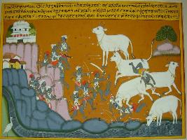 | Description / विवरण | Miniature painting based on Eklinga Mahatmya. It is the story of Kamdhenu cow, who comes to drink water of Mahanadi river, seeing this Kirats come to capitulate her and she is depicted hitting them and running, and they are attacking the cow with bows and arrows, a palace is also depicted here. |