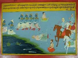 | Description / विवरण | Miniature painting based on Mahabharat depicting Ulluk saying toYudhishthir that the bravery of Arjun and Krishna cannot harm him because they also have warriors like Dushasan who is like a crocodile in water. |