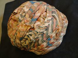| Description / विवरण | This is a specimen of Leheriya pagari of Sanganeri print. Its colours are white, red, yellow, blue, etc. It carries geometrical design on white ground with red yellow, blue colours. |
