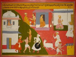| Description / विवरण | Miniature painting based on Mahabharat - Drona parva depicting from Arjun would committed sin if his ran away from war field. just like a Brahman would comitted a sin by lying, like a person would get sin by robbing house where he got shelter or by killing a cow. |
