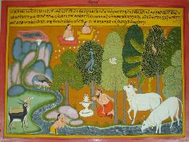 | Description / विवरण | Miniature painting based on Eklinga Mahatmya depicting the importance of tirtha . At the top right, Kamdhenu is coming to forest and saw a river, where peacock is shown drinking water and a deer and stag are seen nearby. At the lower left, Kamdhenu is seen drinking water and to its left, She is shown satisfied and rooming in a forest, where different trees are shown. At the middle, a man is shown worshipping a linga and another taking holy bath. Due to their good deeds, they are leaving for heaven. |