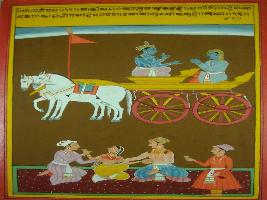 | Description / विवरण | Miniature painting based on Shri Bhagwat Gita. It depicts Krishna preaching Arjun that those people who have lot of tensions and are very desperate and greedy are demons. |