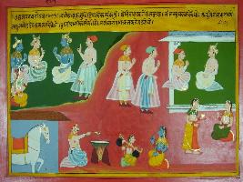 | Description / विवरण | Miniature painting based on Mahabharat depicting Uluk telling Yudhishthir that your cover-up is gone when you all went ot exile and worked under Virat. Bhim worked as a cook, Arjun taught music, Nakul and Sahdeva worked as a cow boy and Draupadi as a servant. |