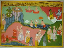 | Description / विवरण | Miniature painting based on Eklinga Mahatmya depicting the importance of Ganga river, by taking bath into which one can purify himself. At the lower right, Indra is killing demon Vratasur who is doing penance with him, Prajapati and one sage are there, to their right, Vratasur is shown lying on ground. At the lower middle part, they are shown leaving with Yamraj. At the lower left, they are shown talking to Brihaspati Muni and asking about the way through which they can get rid of Brahmhatya. At the upper middle part, they are shown taking holy bath and leaving in yaan for swarg lok. |