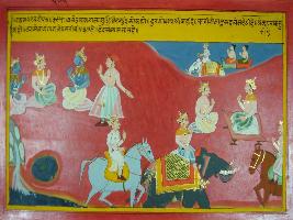 | Description / विवरण | Miniature painting based on Mahabharat depicting Uluk coming as messanger of Duryodhan and telling Yudhishthir that Duryodhana s armies are as fast as Ganga and equal to Devtas armies. |