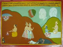 | Description / विवरण | Miniature painting based on Mahabharat - Udyam parva. On the painting Ullung say to Yudhisthir that Bhishma and Drona are all powerful and indefeatable heroes as they are comparable with Devatas. While Ullung suggest Bhishma that why should Pandavas fight against Kauravas. |