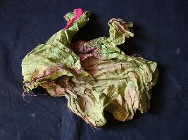 | Description / विवरण | It is a blouse made of Teri cotton. It is having a designed strip its original size has been reduced due to irregular folds. Threads are visible on it. |