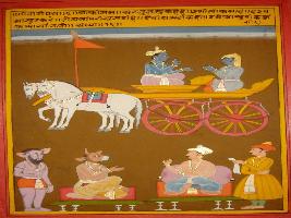 | Description / विवरण | Miniature painting based on Shri Bhagwat Gita. It depicts Krishna preaching Arjun that in this loks Gods and demons live in two different parts and both of them cannot destroy each other completely. |