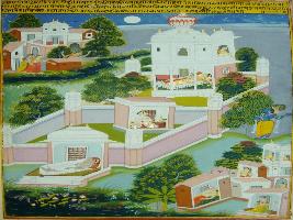 | Description / विवरण | Miniature painting based on Krishna charitra - Sur Sagar depicting Yashoda waiting for Krishna. She is shown lying on bed in her palace. Krishna is shown at outside the palace. At the lower left part, Gopis is depicted coming to roof of their house to watch Krishna coming. At the upper right, Gopis are shown coming to bank of river Yamuna. |