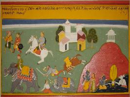 | Description / विवरण | Miniature painting based on Sanskrit drama - Prabodh Chandrodaya depicting the victory of king Karan over the sea, it is compared to Lord Vishnu receiving Lakshmi from Samudra manthan. |