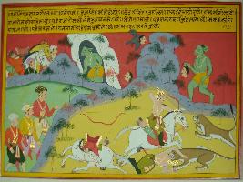 | Description / विवरण | Miniature painting based on Eklinga Mahatmya depicting shooting an arrow on lion, but the lion kills the king and his horse at the lower left. His men are watching this scene and his head is lying on the ground. At the upper middle part, a crow is seen taking his head. At the upper left part, a demon takes his head to Pataal-lok. At the upper right, he is shown coming out of Pataal lok. |