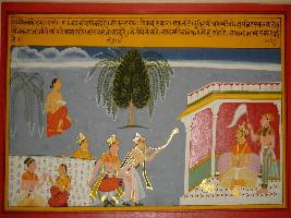 | Description / विवरण | Miniature painting based on Sanskrit drama - Prabodh Chandrodaya depicting a Nat singing that a king gets victory only when he performs sacrifice and penance. He should acquire good qualities like tenderness. |