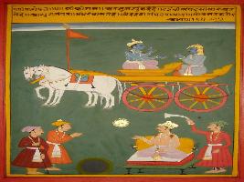 | Description / विवरण | Miniature painting based on Shri Bhagwat Gita. It depicts Krishna preaching Arjun that wealth of Devtas is for moksha and wealth of demons are destroy. So when someone get wealth of Devtas should not hesitate to get. |