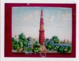 | Description / विवरण | Qutub Minar is painted on ivory of light blue ground and trees around small architectural designs are also depicted and some are shown rulined it is of 5 story and of red colour but recond and front are yellow and white respectively |