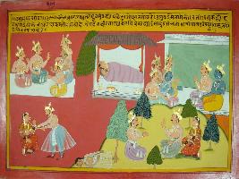 | Description / विवरण | Miniature painting based on Mahabharat - Udyam parva depicting Sanjay is telling to Dhitrastra that Duryodhan has already done wrong with Pandavas now again he had done wrong by sending Ulluk to Pandavas court it indicate bad times are coming for all. |